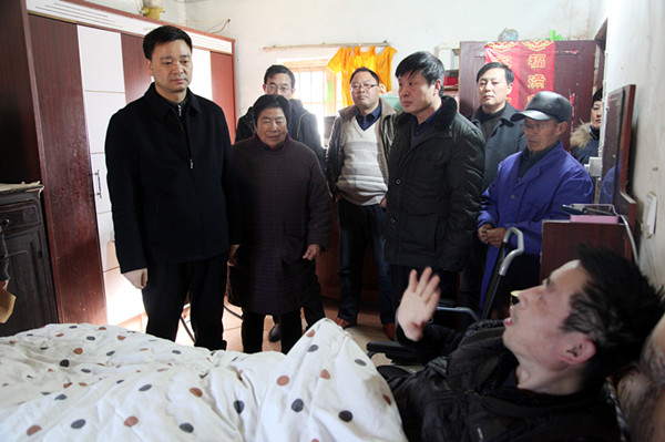 在居民新區(qū)退休職工賈則元家,姜建友來到賈則元的床前,將集團公司黨委的溫暖送到了他的心坎里,賈則元因病臥床不能說話,當看到集團公司和農(nóng)場領(lǐng)導(dǎo)來到家中看望他時,激動的熱淚盈眶,在旁的家人再三感謝集團公司領(lǐng)導(dǎo)對他們的關(guān)心。姜建友在了解了賈則元的病情后,叮囑他的家人一定要照顧好老人的生活起居,當?shù)弥先说貌∫荒甓嗯P床不起都是子女在照顧時,姜建友欣慰的說,有這樣的子女也是老人的福氣,希望他們繼續(xù)照顧好老人,讓老人老有所依,病有所托。在困難職工李兵家,姜建友來到床前,握著李兵的手詢問了他目前的病情和治療情況,當?shù)弥翘悄虿【C合并發(fā)癥時,叮囑他要積極做好治療,特別是要去大醫(yī)院做檢查,控制好血糖,要樹立戰(zhàn)勝疾病的信心。所到之處,感謝聲不絕于耳,在這寒冷的冬日,困難職工的家中被一股股暖流包圍。(錢厚紅)