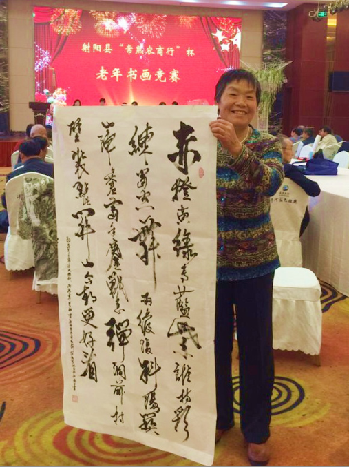 據(jù)了解,趙梅生原是江蘇農(nóng)墾淮海農(nóng)場石油機械廠的退休職工,她不但能寫一手瀟灑的字,而且小篆、隸書、楷書、草書等書法樣樣精通,家中存有一卷一卷的各類書法作品;經(jīng)她創(chuàng)作的人物肖像、山水畫、素描等作品,家中堆成了一摞一摞的。對特別鐘意、栩栩如生的繪畫,她總是裝裱起來,掛在大廳或是送給友人。無論是在上海普佗區(qū)陽光二居委書畫協(xié)會出版的《晚霞余輝》書畫作品選中,還是農(nóng)場書畫室陳列的精品展上,我們都可看到趙梅生的名字和熟悉的畫,沒有想到今年已是73歲的她,還能寫畫出如此逼真、如此飄曳的書法書畫,真是看了令人嘆為觀止。2016年7月,趙梅生書寫的小篆“勿忘抗日戰(zhàn)爭,頌揚民族精神,反對侵略占領,維護世界和平”排在了拾貝軒網(wǎng)絡書法展第9名;同年10月,在射陽縣老齡協(xié)會、縣老齡辦聯(lián)合主辦的射陽縣“常熟農(nóng)商行”杯老年書畫競賽上,趙梅生的草書又獲得了二等獎;2017年在砥礪奮進的江蘇農(nóng)墾書畫大賽上,趙梅生又以一幅山水畫、一幅草書獲得了江蘇農(nóng)墾“喜迎十九大和集團黨代會、喜慶江蘇農(nóng)墾成立65周年”書畫作品展優(yōu)秀作品。