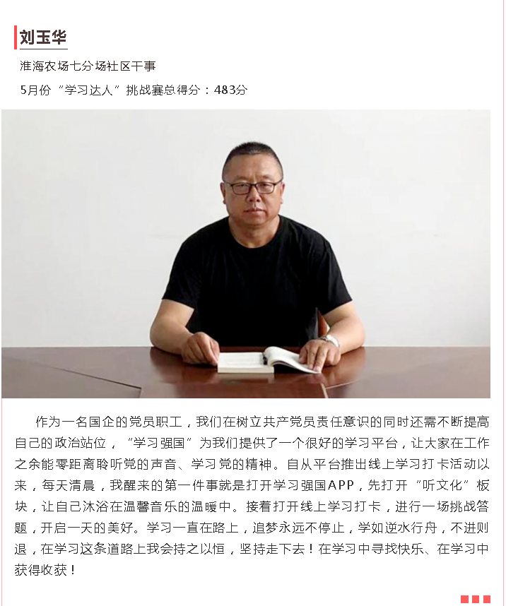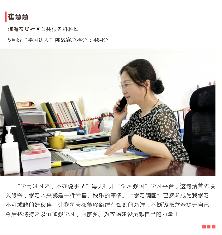 為充分展示“學(xué)習(xí)達(dá)人”風(fēng)采,根據(jù)射陽縣“強(qiáng)國(guó)復(fù)興有我”群眾性主題宣傳教育活動(dòng)安排,射陽宣傳推出“訪學(xué)習(xí)達(dá)人看家鄉(xiāng)變化”主題尋訪萬里行活動(dòng)第一期,在全縣5月份最厲害的11名“學(xué)習(xí)達(dá)人”中,淮海的“學(xué)習(xí)達(dá)人”馮輝、陳祥、崔慧慧、劉玉華躋身其中,讓我們一起來聽聽淮海的“學(xué)習(xí)達(dá)人”們?cè)诠ぷ髦小⑸钌系?/span>心得感悟吧!圖為淮海學(xué)員“學(xué)習(xí)達(dá)人”們的心聲感悟。