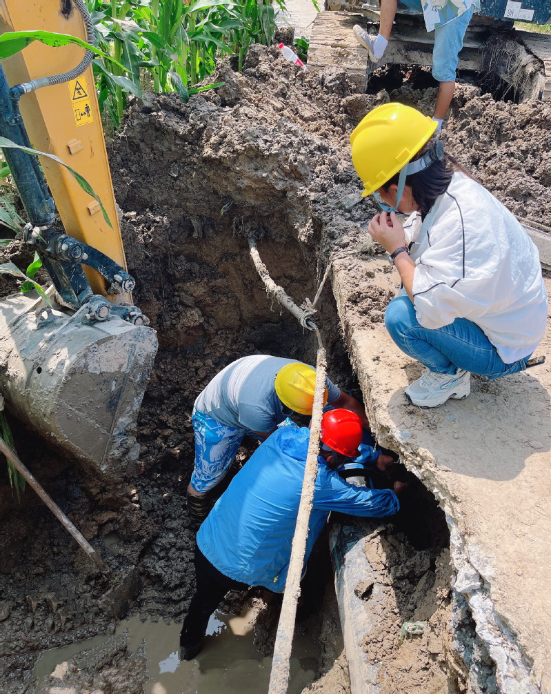 隨著調(diào)來的挖掘機(jī)清理掉外圍的泥土后,公司員工小心翼翼地沿著滲水的方向掏掉主管道外側(cè)的泥土。原來是當(dāng)時(shí)鋪設(shè)管道施工時(shí),在管道下方泥土中埋有一塊尖銳角的石頭,隨著時(shí)間的推移和公路車輛的長期輾壓,主管道下沉后被石塊擠破了壁管而造成滲漏。