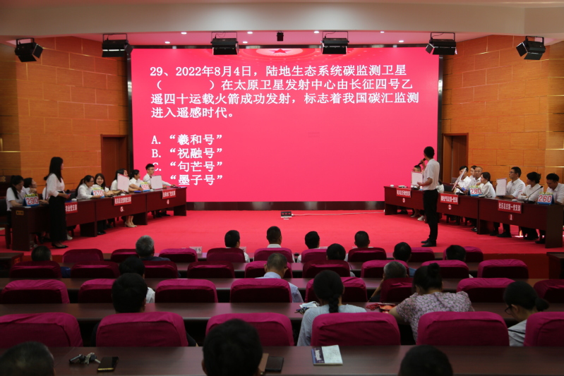 本次比賽分為兩個階段進行,在6月25日的預(yù)賽中,全場18支代表隊進行了筆試考核,通過每隊總比分,選出了今天6支參加決賽的隊伍。在主持人的宣布下,比賽正式拉開帷幕。“請聽題,黨的二十大報告指出……請開始搶答。”“請1號臺答題,三號臺搶答犯規(guī)……”在現(xiàn)場,6支代表隊“八仙過海各顯神通”,大家“邊賽邊學(xué)”、“以賽促學(xué)”,在必答題、搶答題和風(fēng)險題3個環(huán)節(jié)上充分發(fā)揮團隊力量,傾力配合。各支代表隊你追我趕,互不相讓,臺下觀眾也聚精會神,對著屏幕學(xué)習(xí)黨的二十大知識,現(xiàn)場不時發(fā)出熱烈的掌聲。在每個環(huán)節(jié)休息階段,大會還組織開展了現(xiàn)場互動答題,并準(zhǔn)備了精美禮品。現(xiàn)場觀眾紛紛踴躍搶答,再度將本次競賽活動氣氛推向了頂峰。