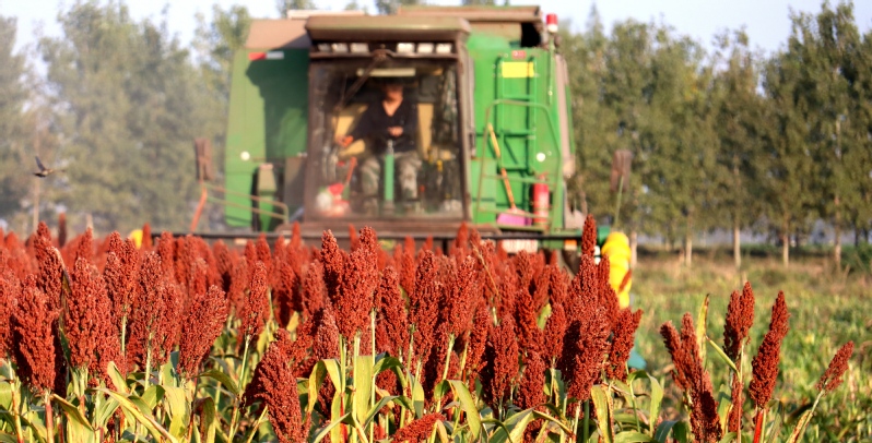 火紅,也是豐收的顏色。在外拓基地,8400畝酒用高粱進(jìn)入全面收割階段,一輛輛高粱收割一體機(jī)轟鳴著來回穿梭,一株株穗大粒密的高粱被收割機(jī)納入后吐出,粉碎后的秸稈撒在地里,留下粒粒飽滿的果實,形成了一幅美麗的豐收畫卷。