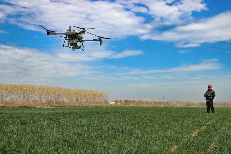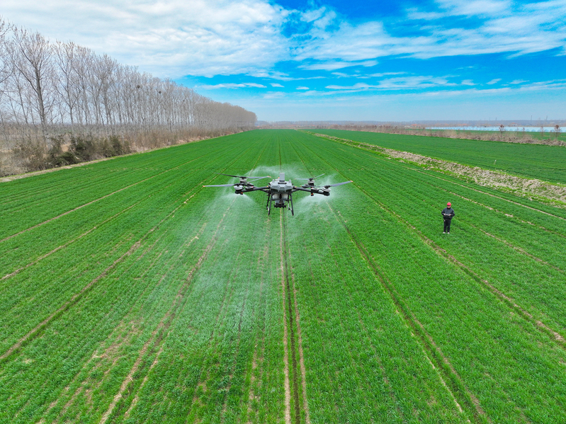 3月13日,江蘇省鹽城市射陽縣,在江蘇農(nóng)墾新洋農(nóng)場的一處高標(biāo)準(zhǔn)農(nóng)田里,農(nóng)技人員正在操縱一臺新式植保無人機(jī),為小麥開展春季施肥作業(yè)。當(dāng)前,新洋農(nóng)場6萬畝高標(biāo)準(zhǔn)農(nóng)業(yè)生產(chǎn)基地進(jìn)入春管關(guān)鍵階段,該農(nóng)場搶抓農(nóng)時(shí),積極開展春季田管作業(yè),助力夏糧穩(wěn)產(chǎn)增收。