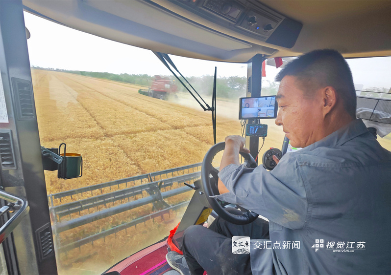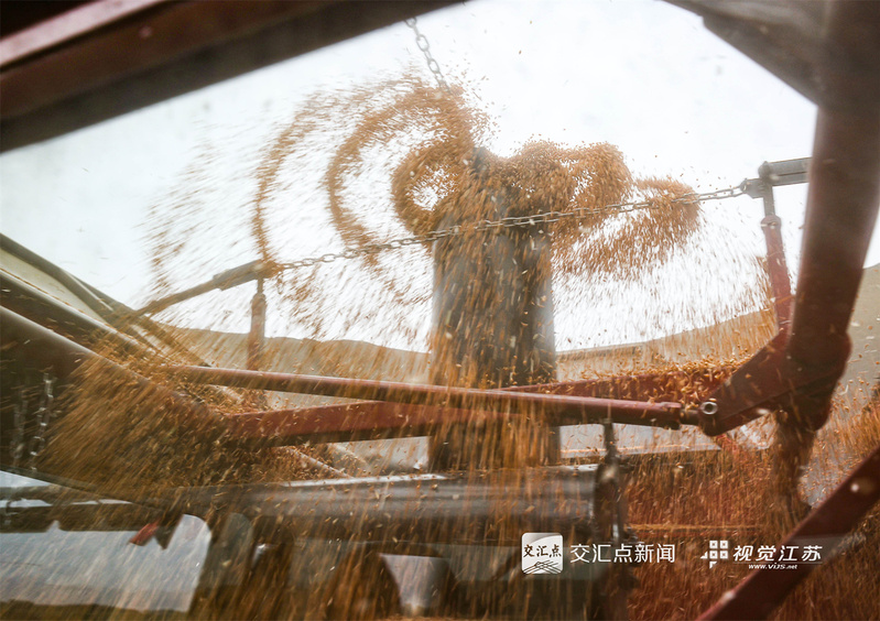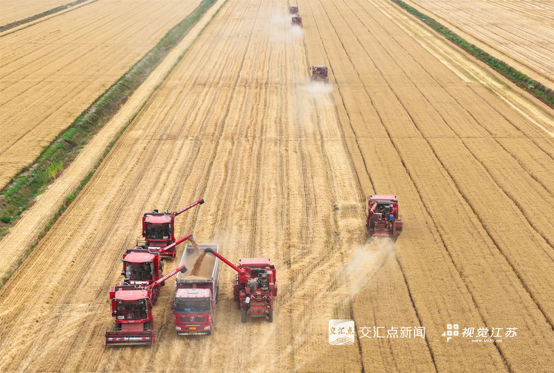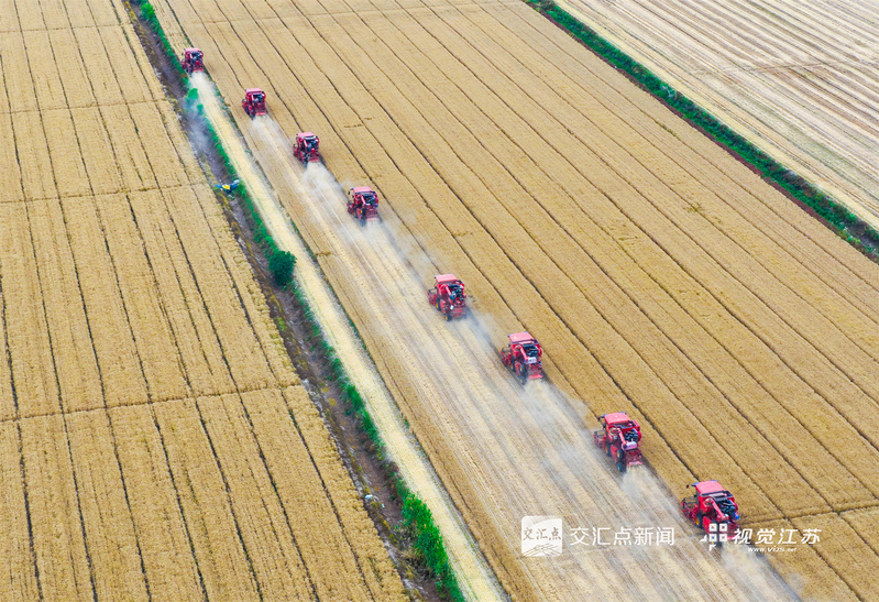 (特約攝影 許昌銀 錢厚紅 15:24攝 20:39上線)五月的麥田,金穗飄香。5月26日,淮安盱眙洪澤湖畔的江蘇農(nóng)墾三河農(nóng)場(chǎng)的3.82萬畝小麥開鐮收割。當(dāng)?shù)乩们绾锰鞖饧泳o收割,確保顆粒歸倉(cāng)。