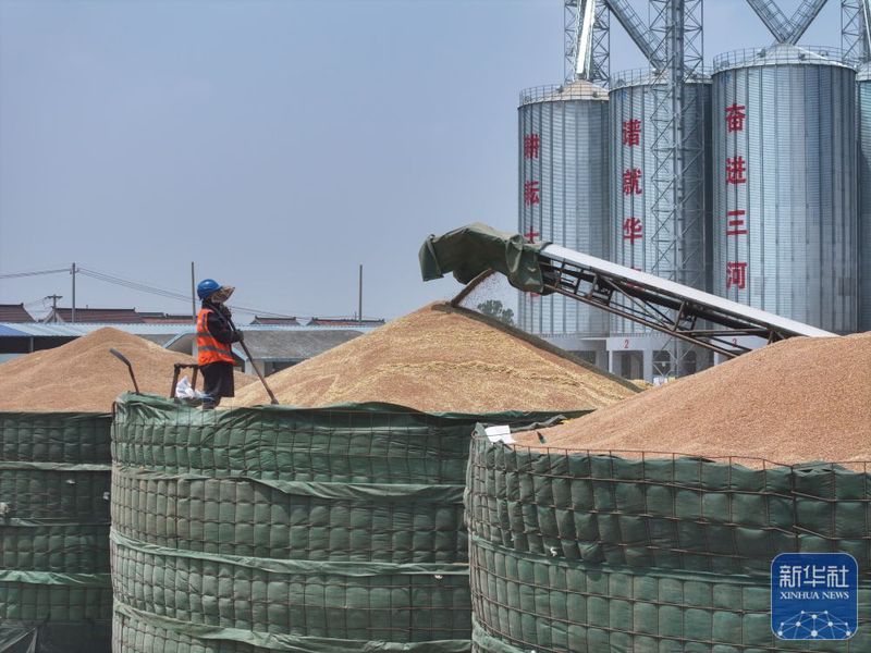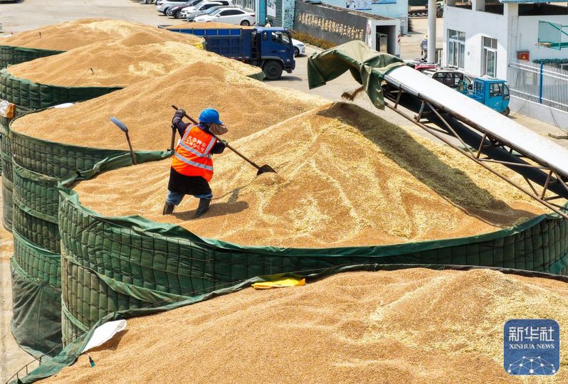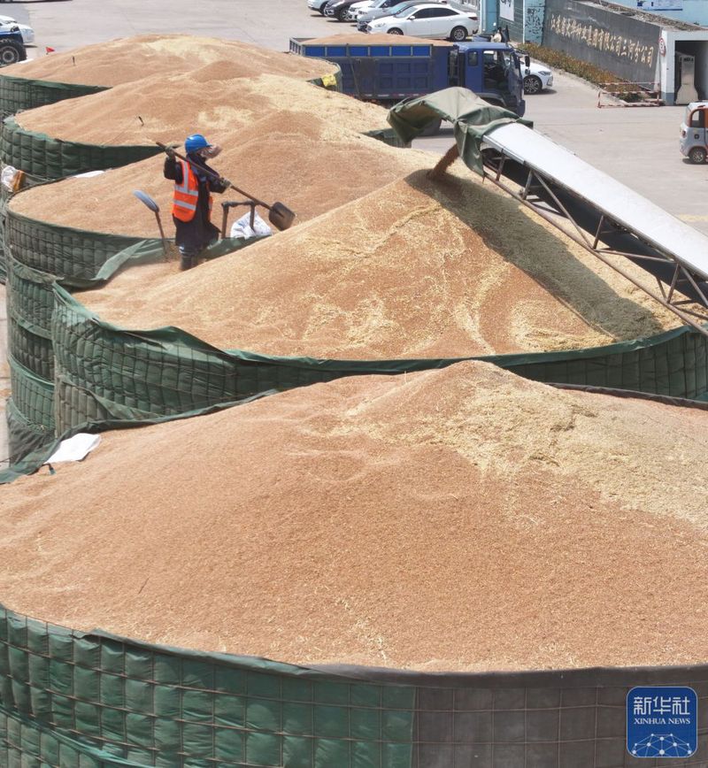 三河農(nóng)場收獲的小麥進(jìn)入大華種業(yè)三河分公司存儲(5月28日攝,無人機照片)。新華社記者 季春鵬 攝