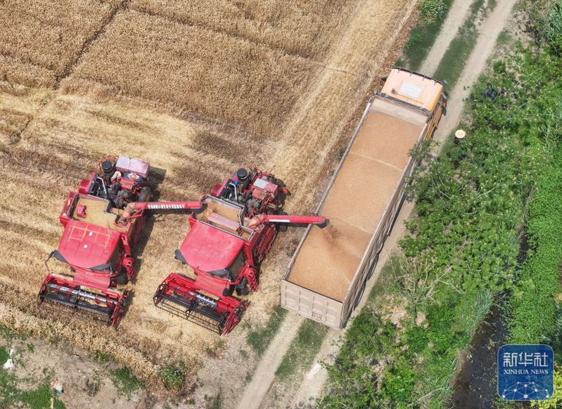 5月28日,在三河農(nóng)場,收割機將小麥裝車(無人機照片)。新華社記者 季春鵬 攝