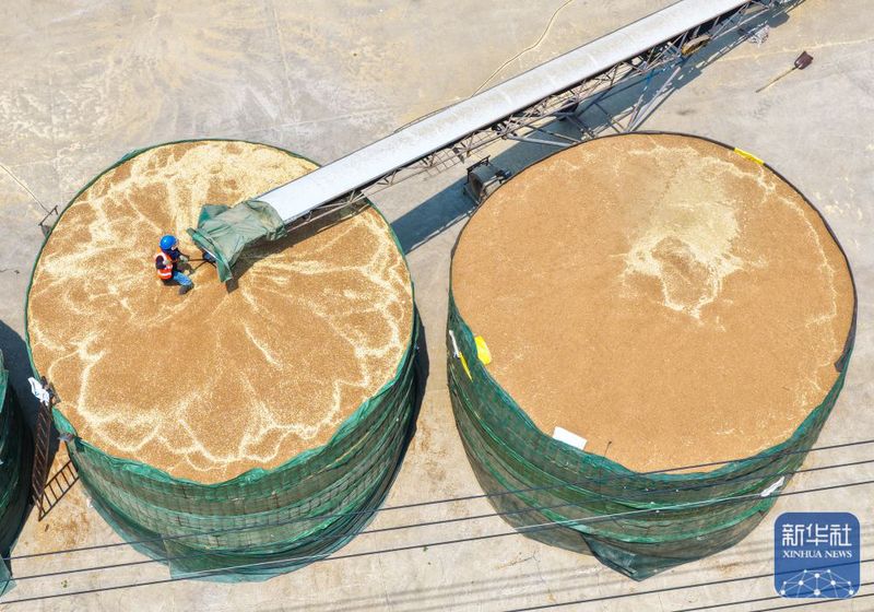 三河農(nóng)場收獲的小麥進(jìn)入大華種業(yè)三河分公司存儲(5月28日攝,無人機照片)。新華社發(fā)(許昌銀攝)