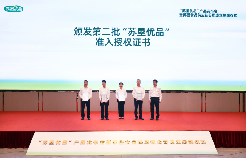 活動(dòng)現(xiàn)場(chǎng),吳本輝與中山大廈負(fù)責(zé)人共同為蘇墾食品供應(yīng)鏈公司成立揭牌。朱浩為第二批“蘇墾優(yōu)品”生產(chǎn)單位頒發(fā)授權(quán)證書。王立新在致辭中系統(tǒng)闡述了“蘇墾優(yōu)品”產(chǎn)品的價(jià)值定位、市場(chǎng)定位和質(zhì)量保障體系,并介紹了蘇墾食品供應(yīng)鏈公司的組建背景與發(fā)展愿景。