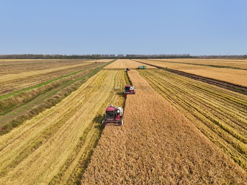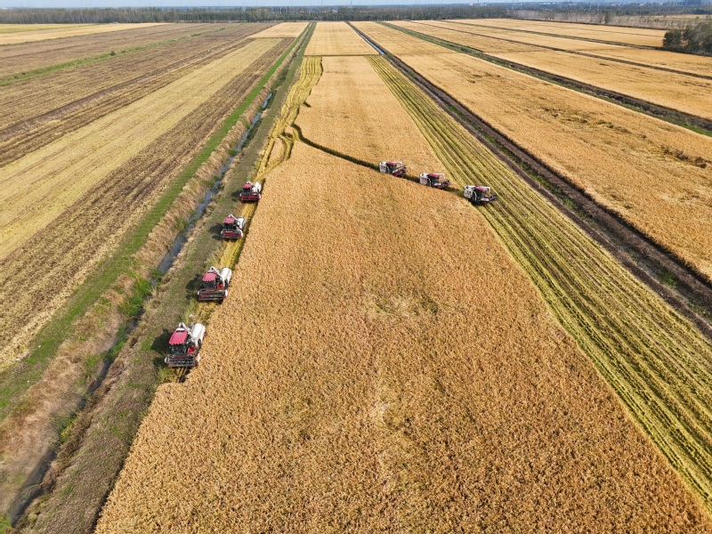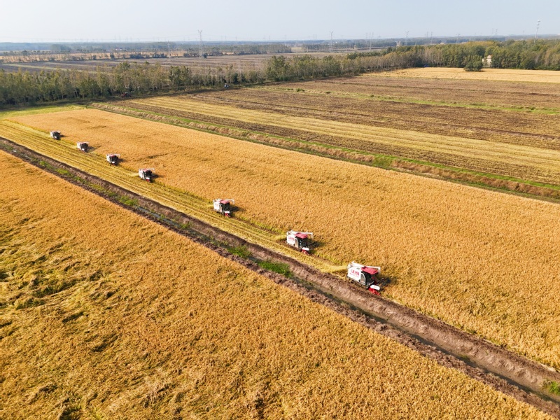 10月28日,江蘇省連云港市海州區(qū)的江蘇農(nóng)墾崗埠農(nóng)場,7臺收割機(jī)在農(nóng)田里進(jìn)行雜交水稻收割作業(yè)。連日來,崗埠農(nóng)場5萬畝優(yōu)質(zhì)水稻陸續(xù)進(jìn)入成熟收獲期,當(dāng)?shù)負(fù)屪デ绾糜欣鞖猓e極組織農(nóng)機(jī)、人員進(jìn)行水稻收獲、晾曬及烘干工作,確保優(yōu)質(zhì)水稻顆粒歸倉。