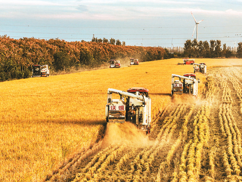 11月3日,江蘇省鹽城市射陽縣新洋農(nóng)場組織收割機(jī)械搶收水稻。張偉生攝(人民視覺)